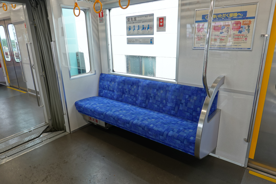 優先席は青系のモケットとなっています。座席下には消火器が設置されています。設置というより隠されているといった雰囲気ですが。