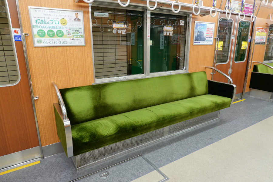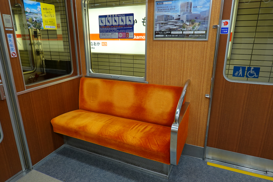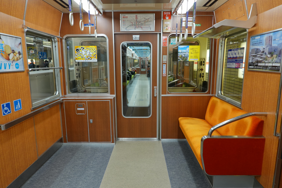 内装の雰囲気は阪急とそっくりで、ドア横以外に握り棒が無いため開放感があります。座席は一般席がゴールデンオリーブ色、優先席はオレンジ色です。