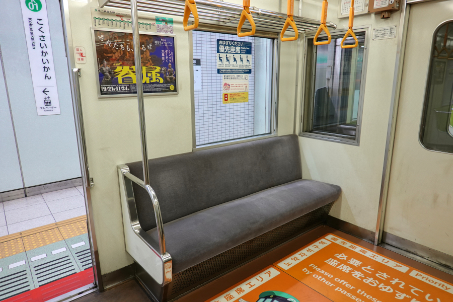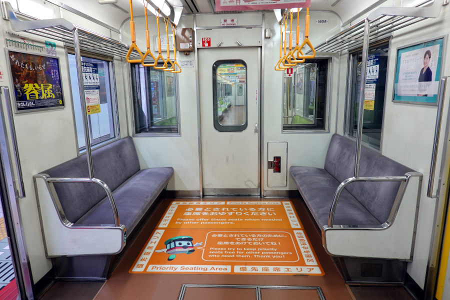 車端部には優先席が設けられていて、床面にはデカデカとステッカーが貼付されています。貫通扉の窓は小さめですが、妻窓があるのである程度の解放感はあります。
