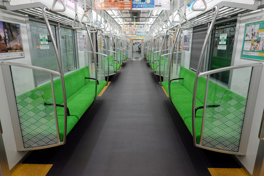 車内は袖仕切りの大型化で快適になり、開放感もあります。灰色系の車内で座席の緑色が非常に鮮やかに見えます。