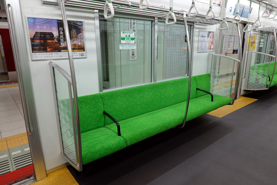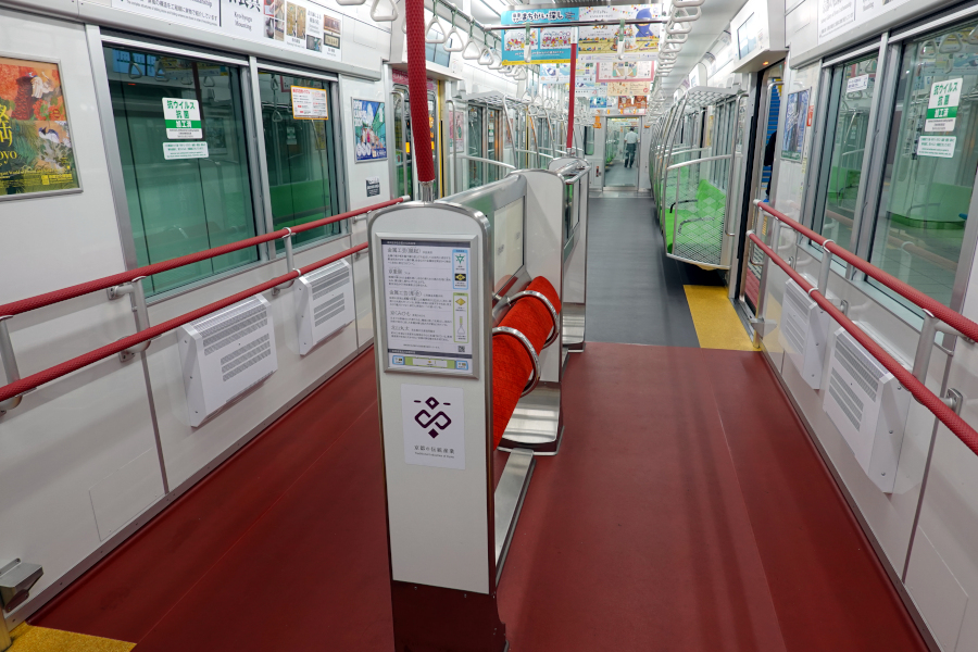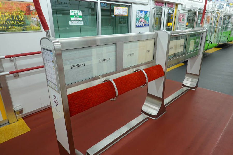 このスペースがどの程度役に立つのかは不明です。立ち掛けシートには京都の伝統工芸品を展示する「素材飾り付けスペース」と称するものが設けられているのですが、今回取材した編成には展示されているようには見えませんでした。