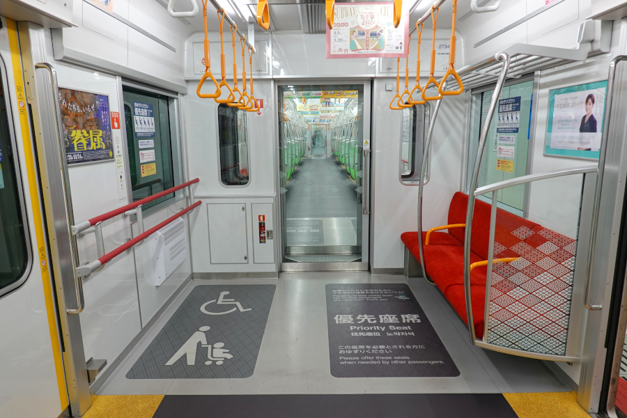 両先頭車には「おもいやりエリア」と呼ばれるスペースが設けられていて、車いす・ベビーカー利用者に配慮した構造となっています。中央には立ち掛けシートも設けられています。西武40000系とは異なり側窓のサイズは他と同じです。