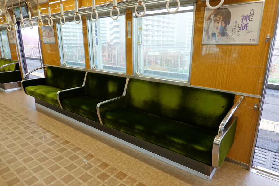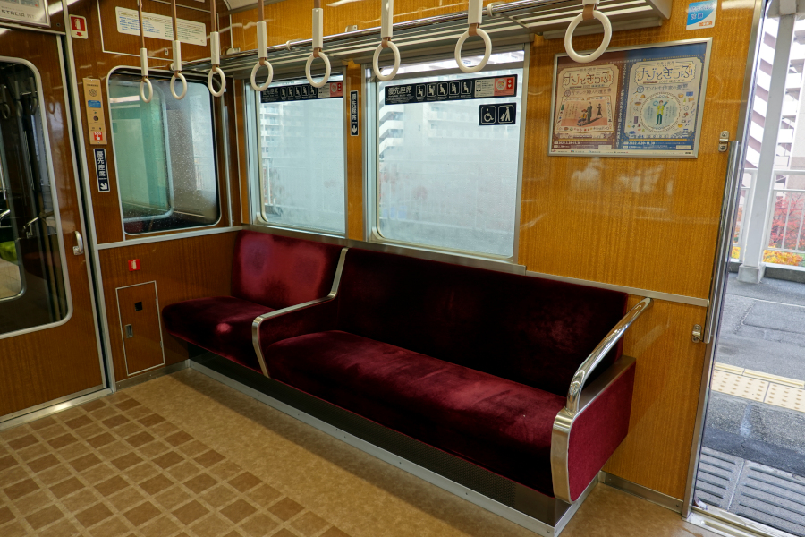 座席は袖仕切りで3+2+3に区切られています。個人的には握り棒が欲しかったですが、関西では握り棒を備えた車両は少なく感じます。