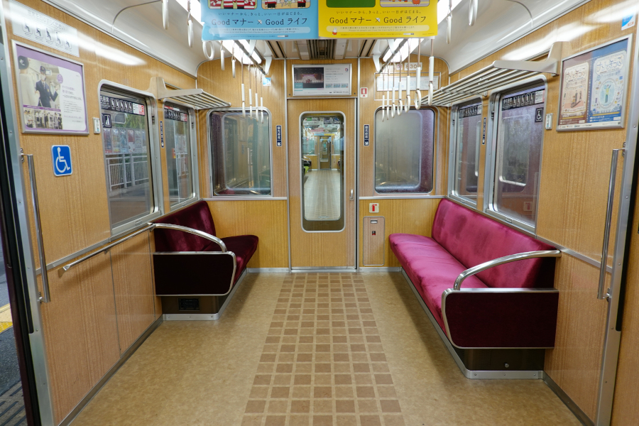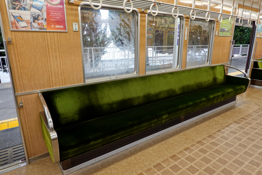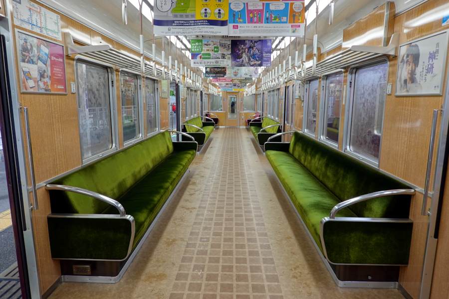 座席はバケットタイプではなく、握り棒で仕切られてもいません。着席区分が存在しないので正確な人数は分かりませんが、8人掛けではないかと思われます。