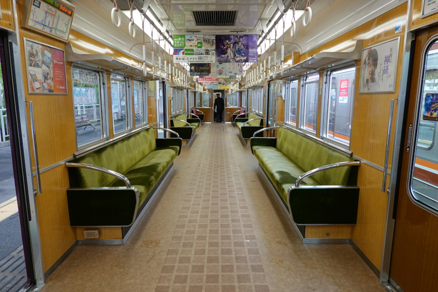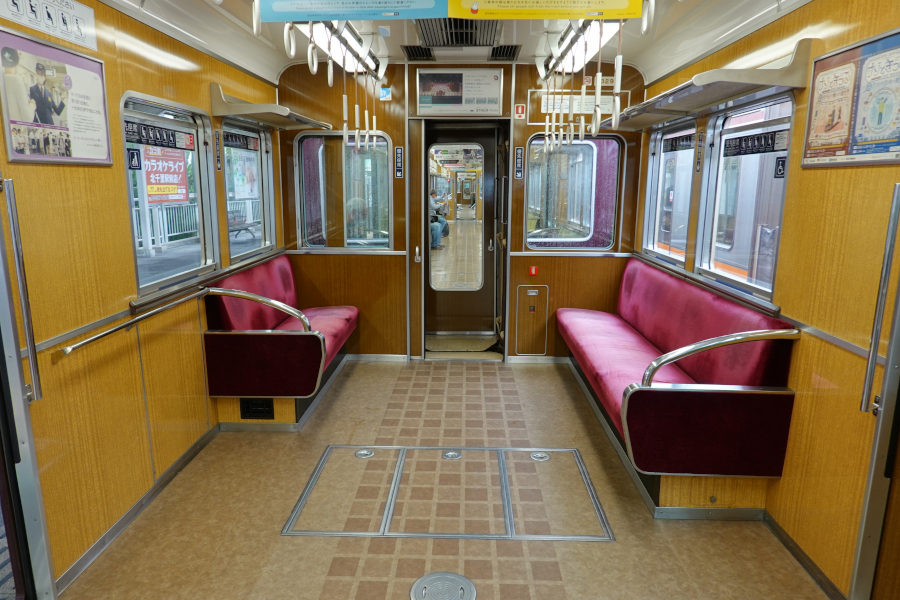 リニューアルによって1960年代に製造された車両とは思えないほど車内は綺麗な状態です。見切れていますが、左端にはドア横にLED表示器が設けられています。