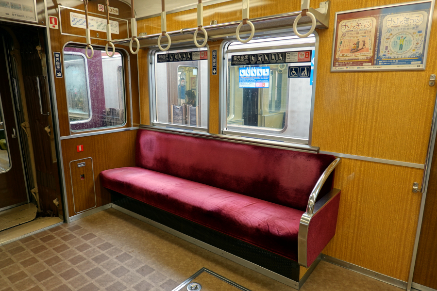 車端部には優先席とフリースペースが設けられています。リニューアルによって新型車両と遜色ないサービスレベルが保たれています。妻面のみ壁面の色合いが異なります。
