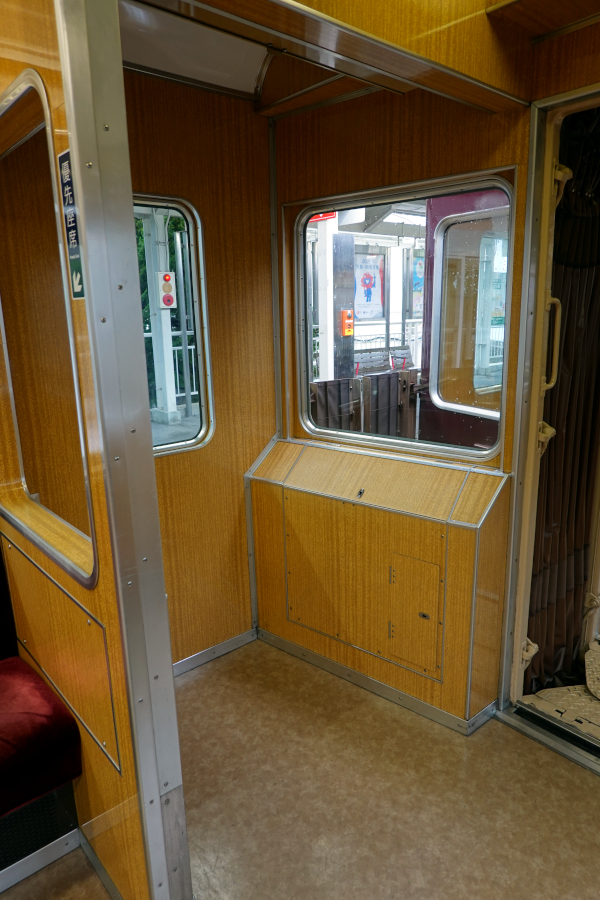 運転台跡を見ると綺麗に撤去されていて、乗務員扉跡には側窓が設置されています。ただ他形式の運転台撤去車とは異なり座席は設置されていません。