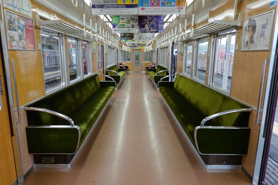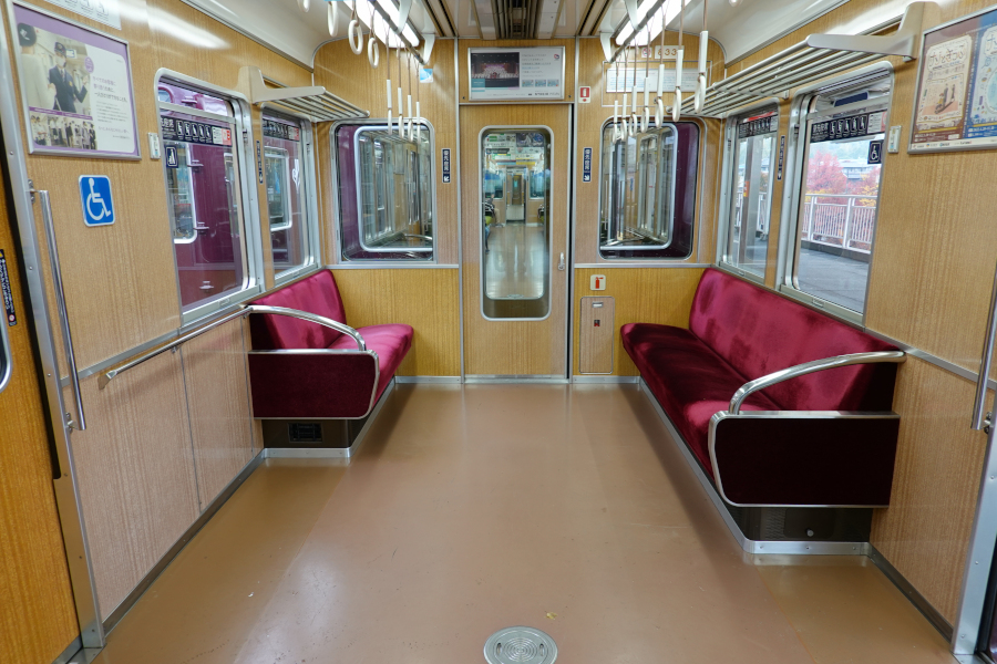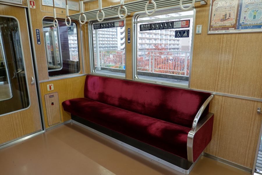 優先席のモケットは赤紫色となっています。運用開始からそれなりの年数が経過していますが、車内外ともに綺麗な状態が維持されています。入念なメンテナンスで末永く使うのが関西私鉄の風潮でしょうか。