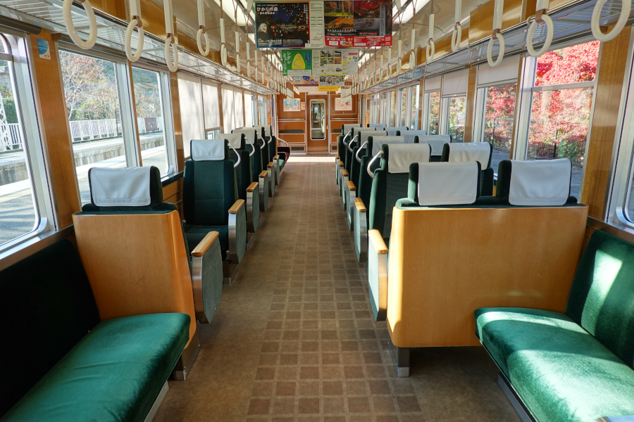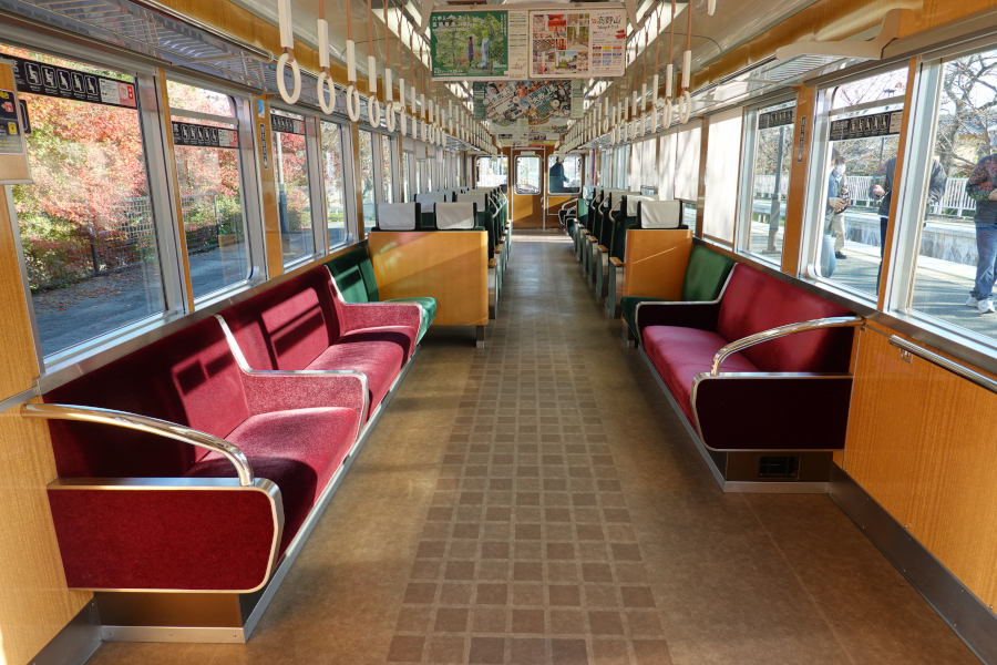 車内はかつて全席転換クロスシートだったようですが、嵐山線への転用時にドア付近はロングシートに換装されています。9300系にその他の通勤型車両の雰囲気を加えたような雰囲気となっています。