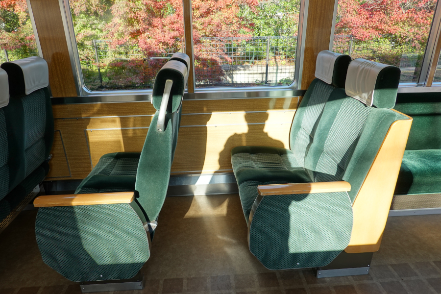 転換クロスシートは車両中央の6列のみ残されています。転用前は2+2列でしたが、現在は繁忙期の混雑を考慮して1+2列になっています。