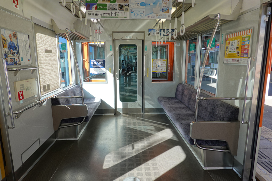 車内もリニューアルによって綺麗になっています。座席の袖仕切りが独特な形状をしています。照明にカバーが付いているのが関西らしさを感じます。