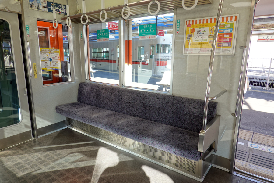 優先席は灰色のモケットとなっています。つり革の色は一般席と同一のものです。
