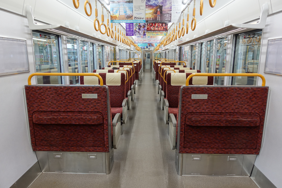 内装は転換クロスシートを中心に構成されています。また一部を除いてドア横には補助席も設置されています。LED照明の採用で非常に明るい車内です。