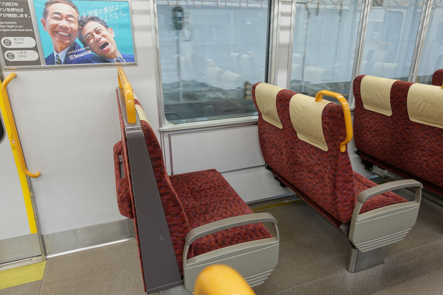 優先席のモケットはJR西日本でお馴染みのものとなっています。ただ平らなだけの袖仕切りはもう少し工夫が欲しかったです。