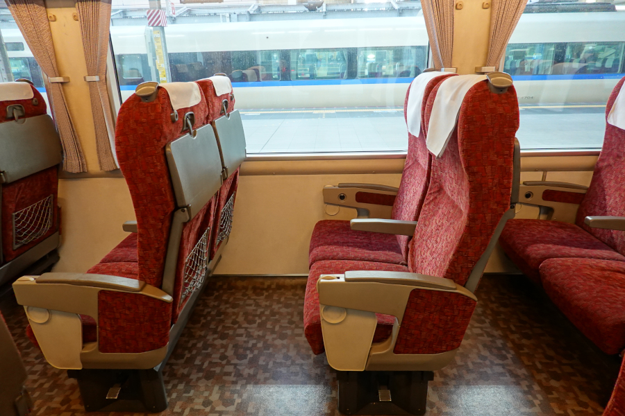 座席はサンダーバードでよく見るタイプのもので、肘掛けに小型テーブルが付いています。せめてドリンクホルダーくらいは欲しかったところです。