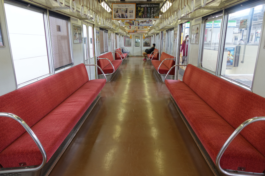 車内はオールロングシートで、座席とつり革が整然と並んでいます。一見すると2800系にそっくりですが、袖仕切りのパイプがコの字型ではなく「つ」の字型となっています。