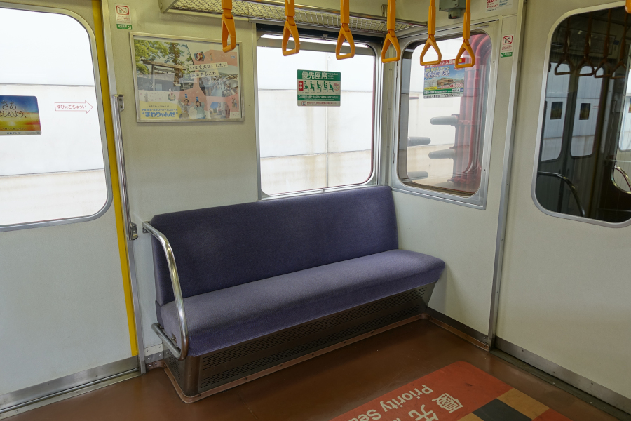 車端部は優先席が設けられています。妻窓が大型で車内は開放感があります。床面に貼付されている優先席ステッカーは新型車両でも採用されているものです。