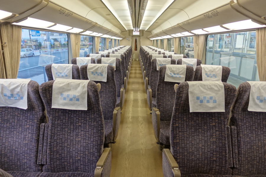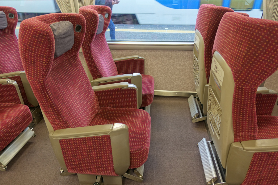 デラックスカーは2+1列の配席でゆとりある空間となっています。通常の特急料金に加えて210~520円の追加投資で利用可能なので、非常にコスパの良い座席と言えます。