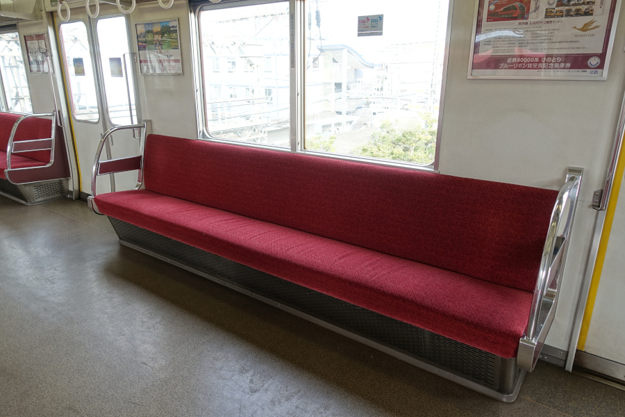 車内はリニューアルが実施されて、床材と座席モケットの交換が行われています。袖仕切りは近鉄通勤車両のリニューアルでお馴染みのデザインで、仕切りとしての能力は期待できない代物です。