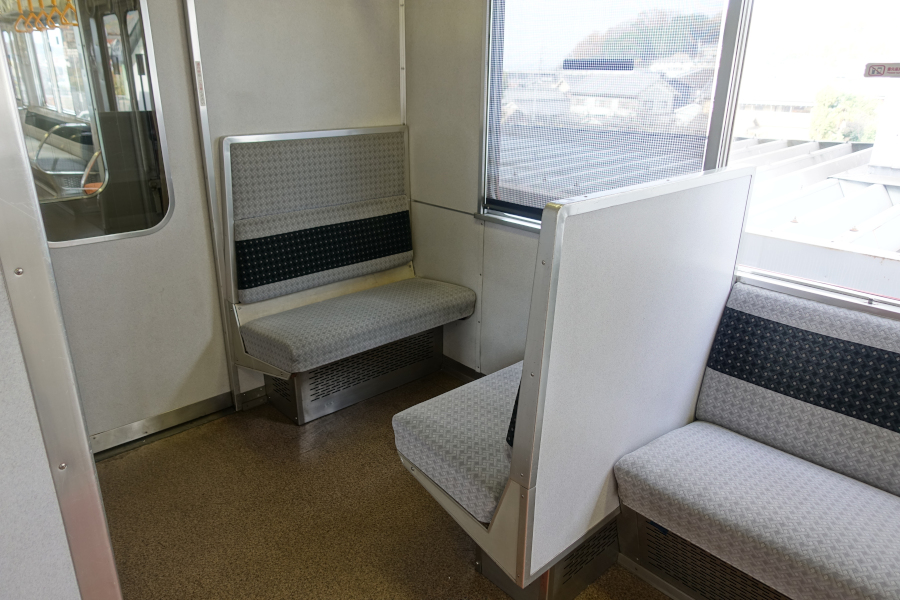 クロスシート時代の痕跡は一切感じさせない内装は、合計で2度の更新工事を受けています。1970年代の製造だとは思えないくらい状態は良好です。
