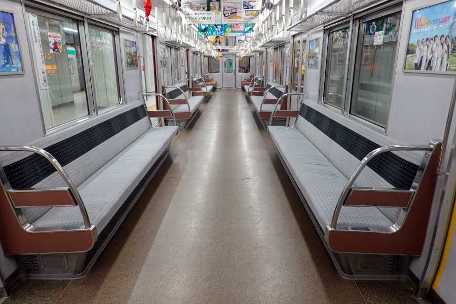 座席はバケットタイプでは無く、6人掛けと思われます。近鉄の更新車で見かけるこのモケット結構好きです。