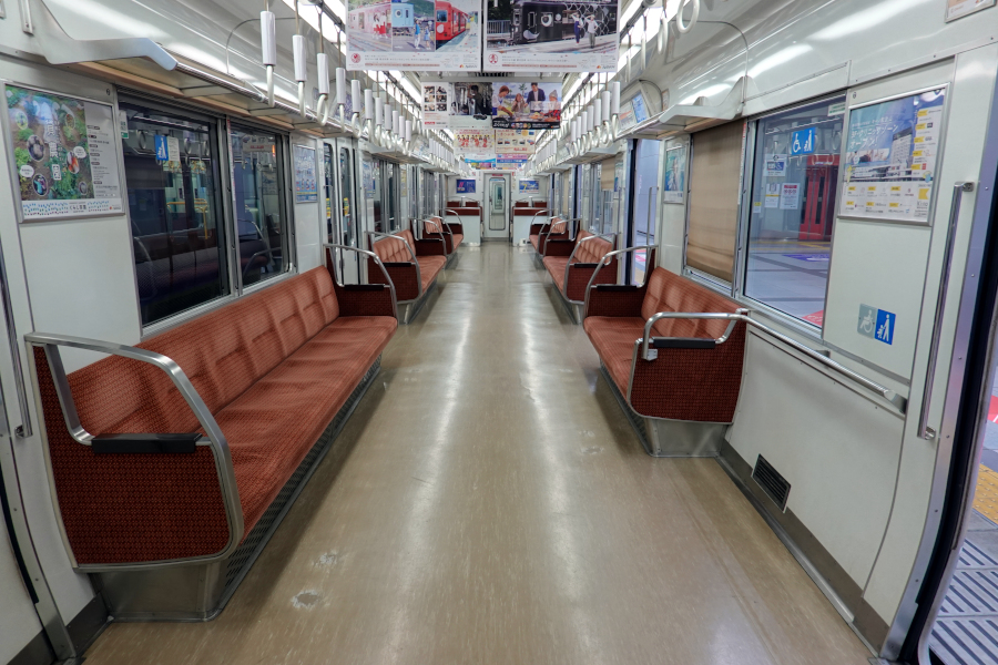 車内は基本的にロングシートで構成されています。内装はリニューアルが行われて色合いが変わりました。袖仕切りが小型なのは関西ではもはや定番ですね。フリースペースが車端部ではなく車内中央寄りに設けられている点が特徴的です。