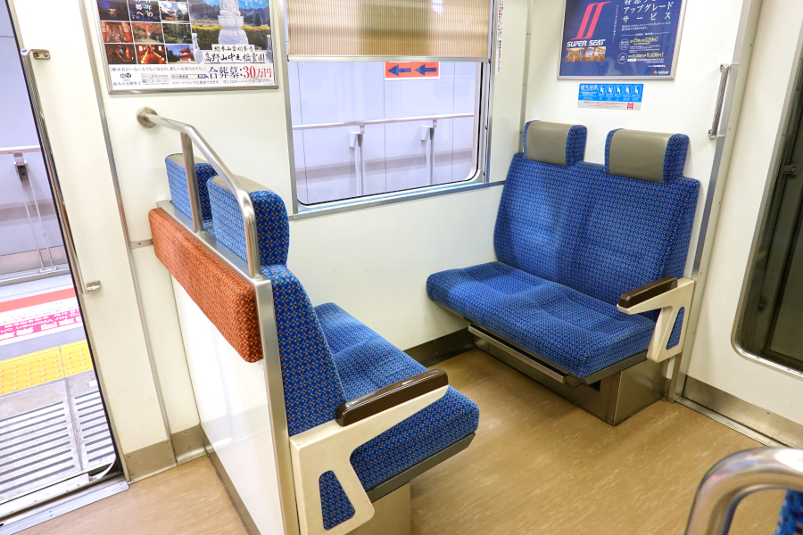 車端部はボックス席となっています。ロングシート車端部クロスシートという構成は全国的にも珍しいと感じます。ボックス席背面には腰当てが設けられていて立客にも配慮されています。