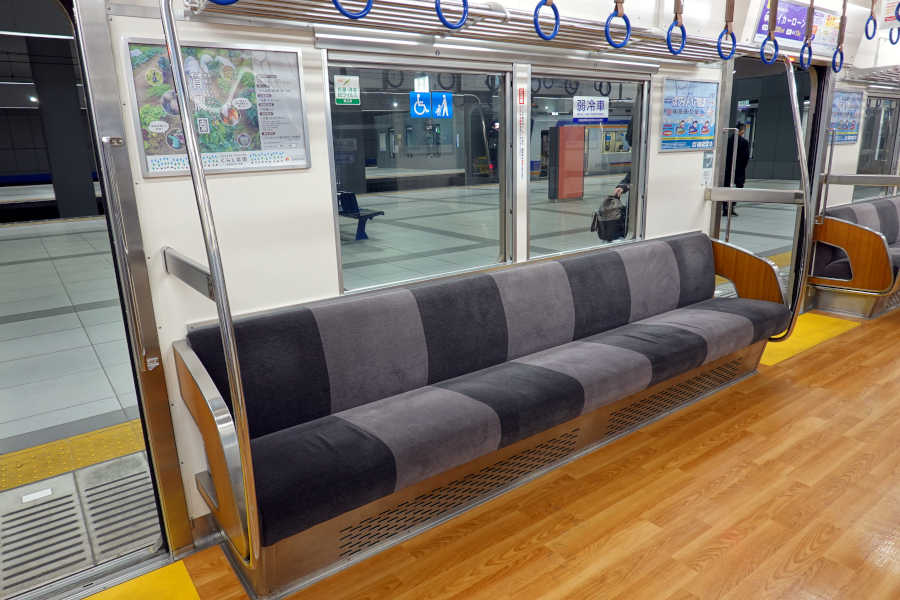 7人掛けの座席は灰色の濃淡で1人分ずつ区分されています。袖仕切りはリニューアルで上部にバータイプのものが追加されています。