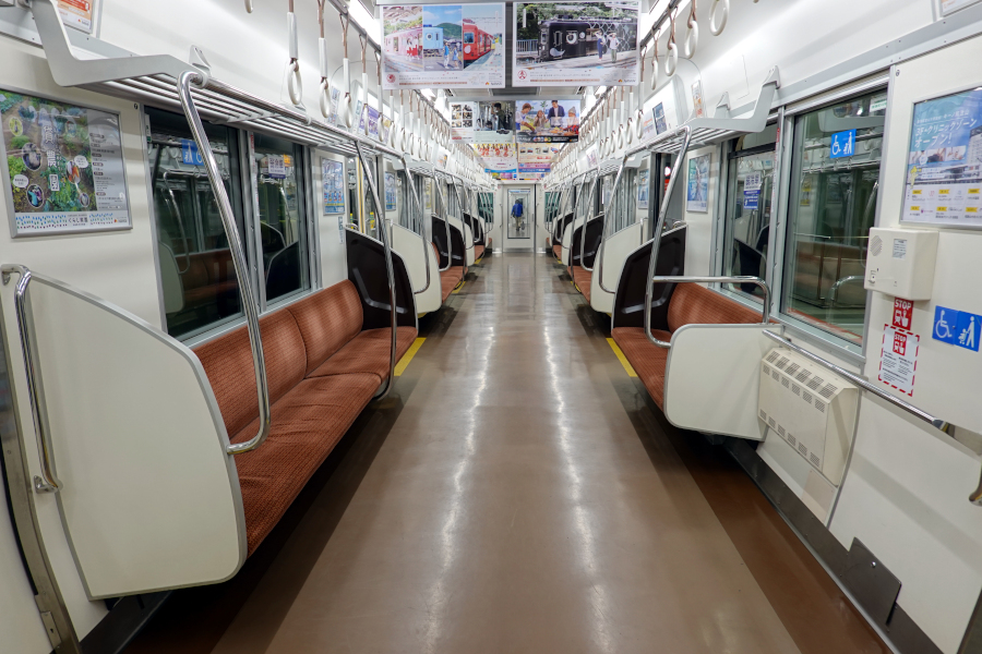 オールロングシートの車内には、関西の鉄道車両としては比較的珍しい大型の袖仕切りが設けられています。