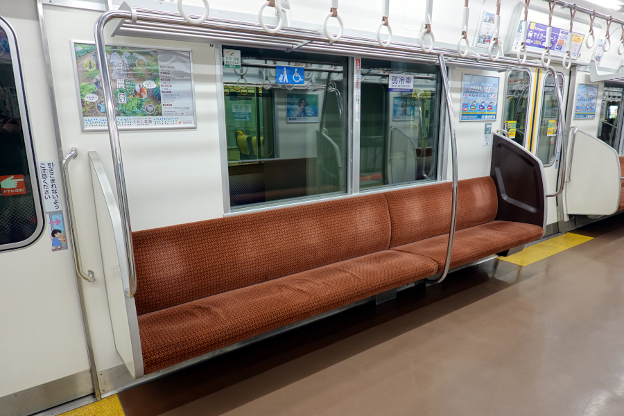 2~5次車と9次車に設置されているバゲージスペースは1次車には設けられていません。そのためドア間の座席は7人掛けとなっています。握り棒で4+3人に分割されています。