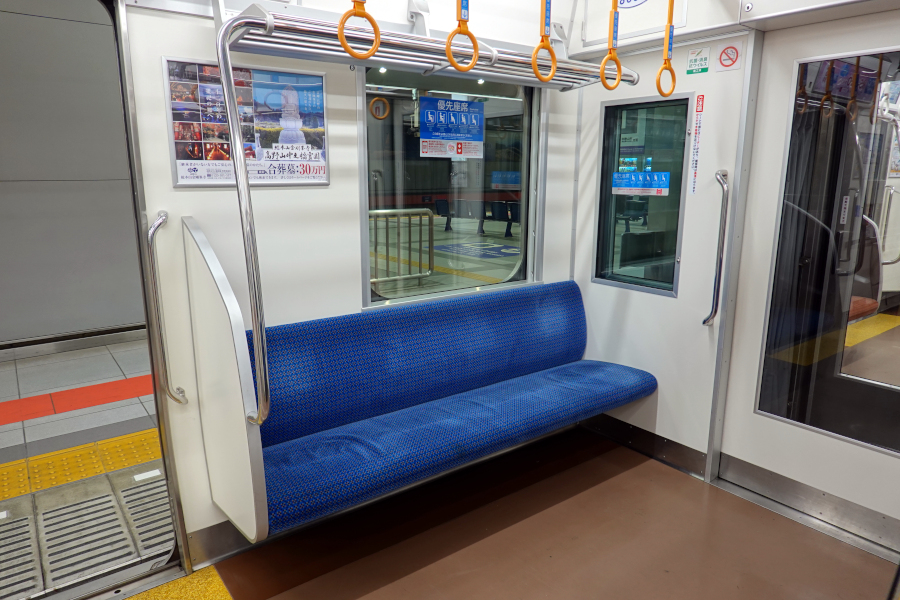 優先席は青色のモケットで4人掛けとなっています。妻面にも握り棒が設けられているのは便利ですね。