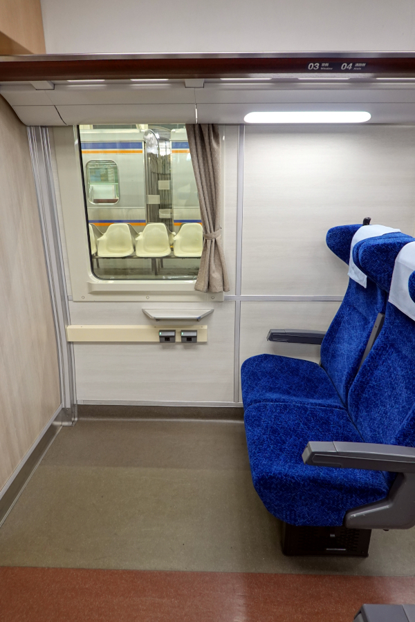 3号車寄りでは客室の一部となっていて、何もない空間が広がっています。足元は広いですが背面テーブルなどが使えずハズレ席と言えそうです。コンセントは一応窓側に2口用意されています。