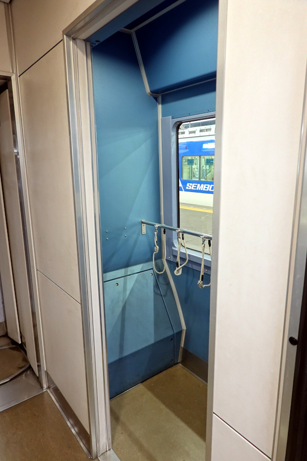 2号車寄りではドアの無い謎の区画となっていて、荷物置き場として機能しているようです。現在南海の特急列車は全て4両編成(サザン及び一部列車は8両編成)なので、この準備工事が役に立つ場面は訪れるのか疑問です。