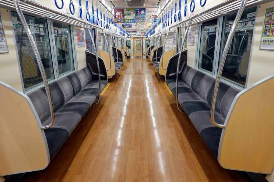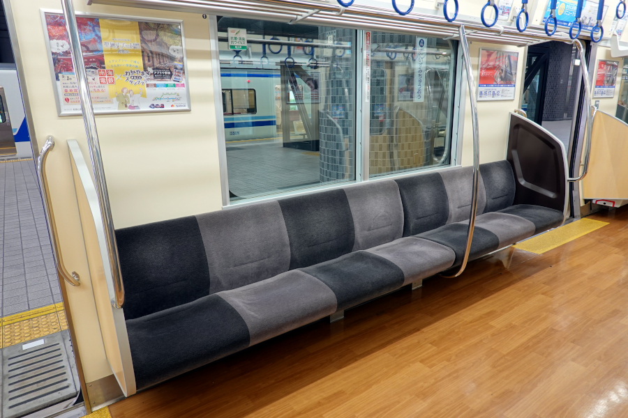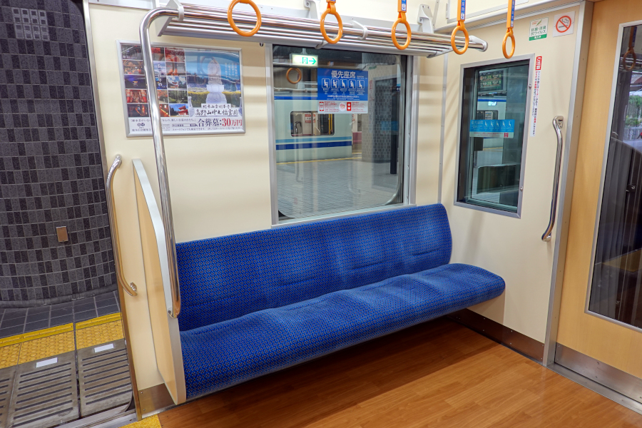 座席は灰色の濃淡で着席区分がはっきりしています。なお8000系では2本設置されていた握り棒は1本に減らされています。