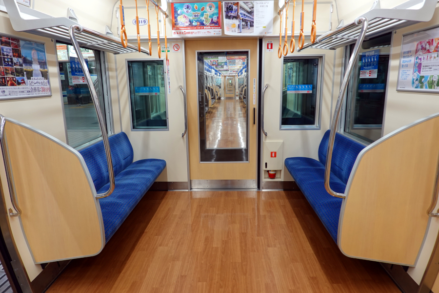 内装は8次車以降で大きく雰囲気が変わっています。床面は木目調で全体的に明るい雰囲気です。これは9000系のリニューアル企画「NANKAI マイトレイン」仕様とよく似ています。
