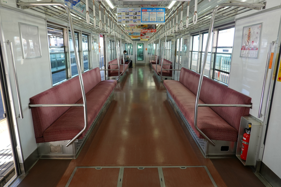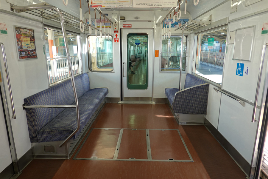 山陽電鉄の車両の中でも古参にあたるのが3050系です。製造時期によって仕様が異なり、今回取材した3060編成は3次車に該当します。1977年の製造ですが、2013年にはリニューアル工事を受けているので車体は綺麗な状態です。