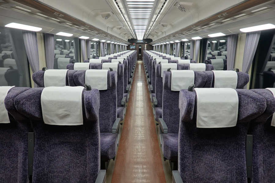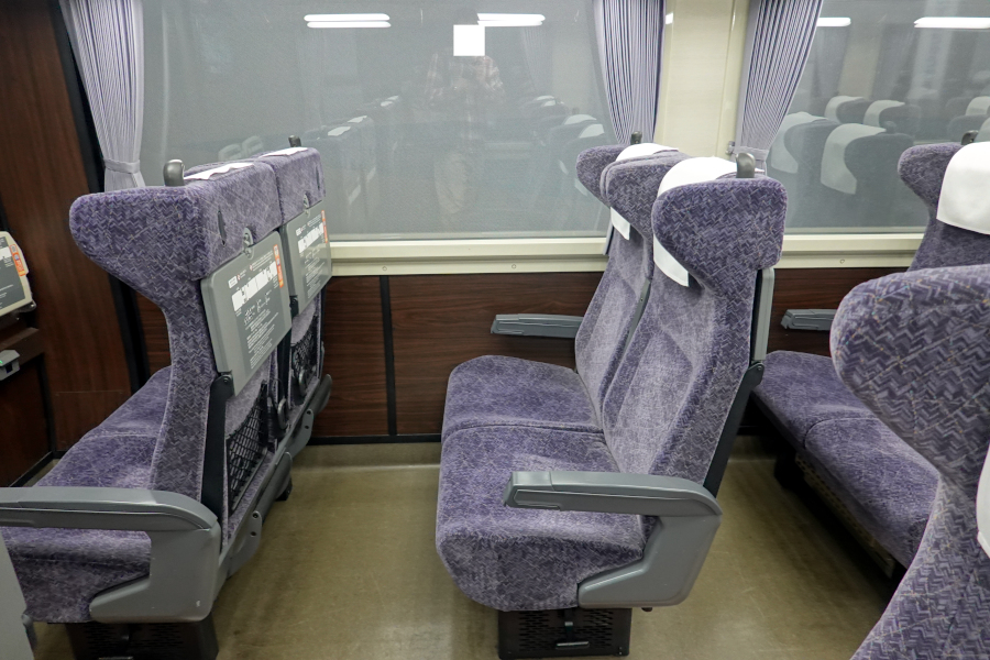 各号車で座席モケットの色は異なっていて、3号車は紫色となっています。