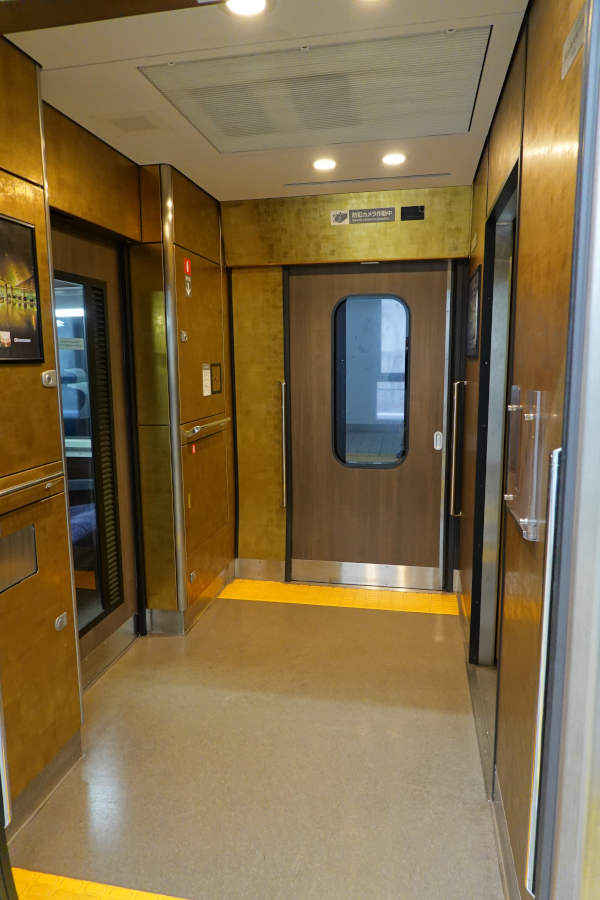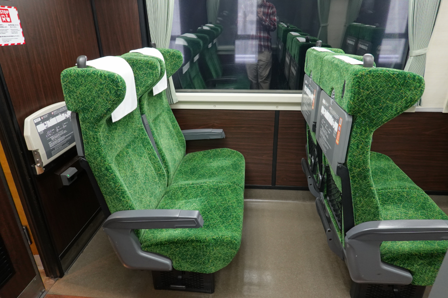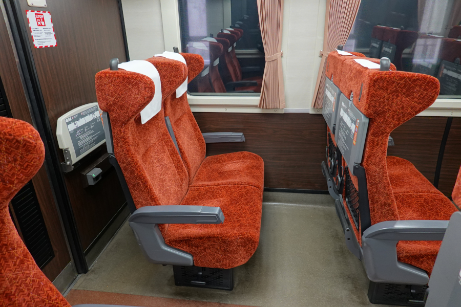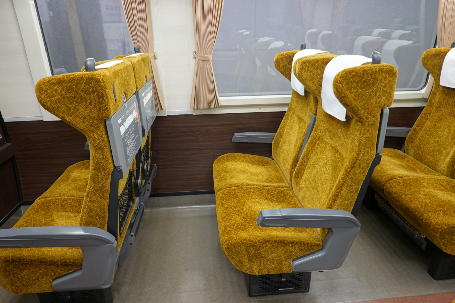 1号車は黄色のモケットです。車体やデッキの金色を考えると全車この色でも良さそうです。