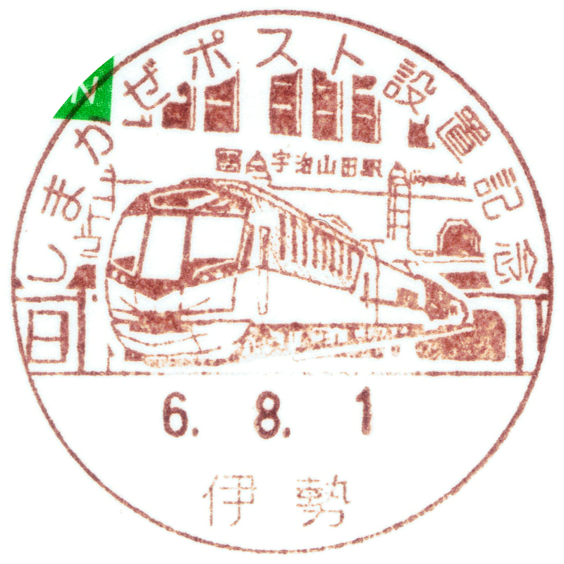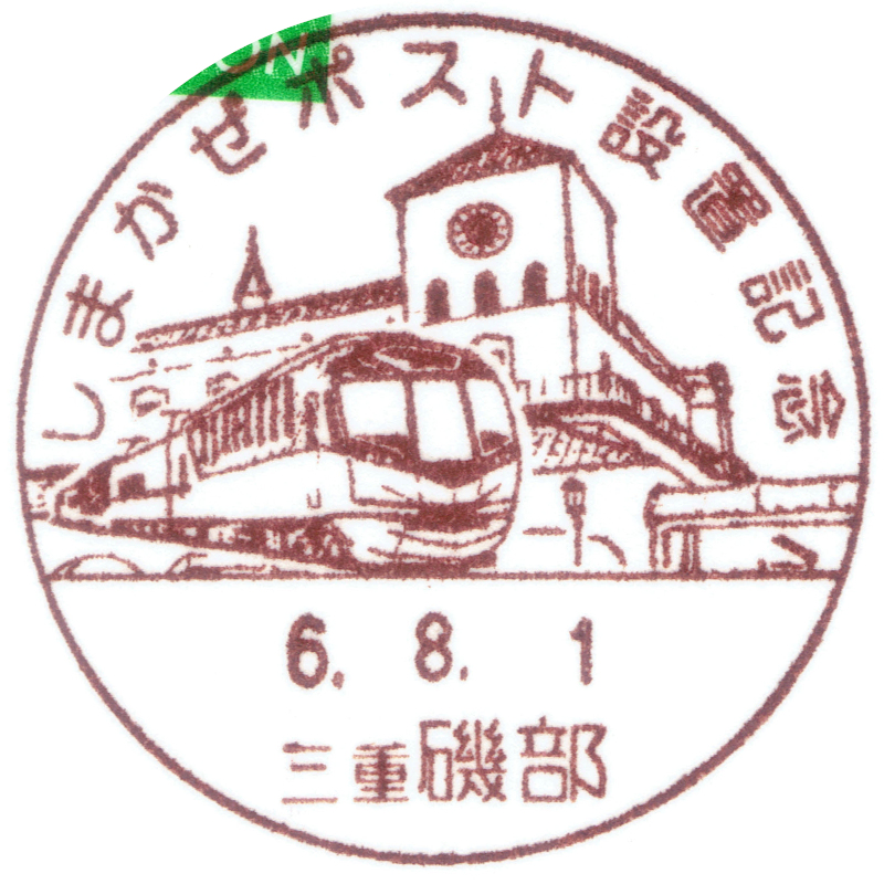 しまかぜポスト設置に伴う小型印が近鉄沿線の局で設置されました。磯部局のものは「近畿日本鉄道の観光特急「しまかぜ」と磯部駅駅舎を描く」とあります。 |