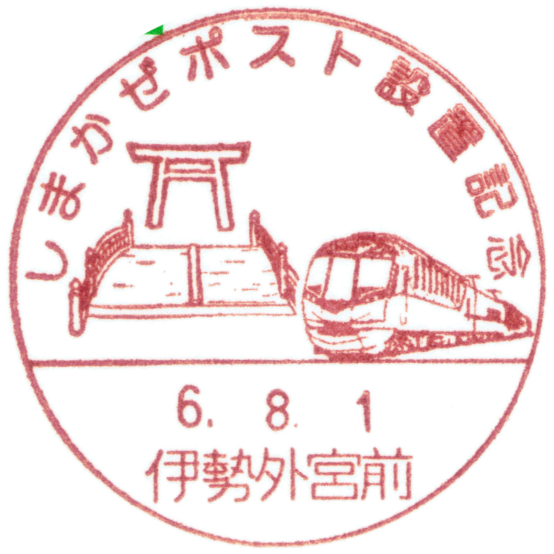 伊勢外宮前局の小型印は「近畿日本鉄道の観光特急「しまかぜ」と伊勢神宮の鳥居と火除橋を描く」とあります。しまかぜが非常に小さくおまけ程度に描かれている事や、全体的に空白が多く物足りない印象です。 |