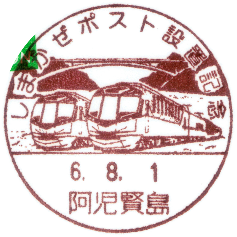 阿児賢島局の小型印は「近畿日本鉄道の観光特急「しまかぜ」と賢島大橋を描く」とあります。しまかぜが2編成並ぶ光景は終点の賢島駅で見ることが出来ます。 |