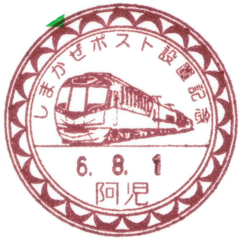 阿児局の小型印は「近畿日本鉄道の観光特急「しまかぜ」とスペイン風皿を描く」とあります。志摩スペイン村の最寄り駅が近隣にあるので図案にも反映されているようです。 |