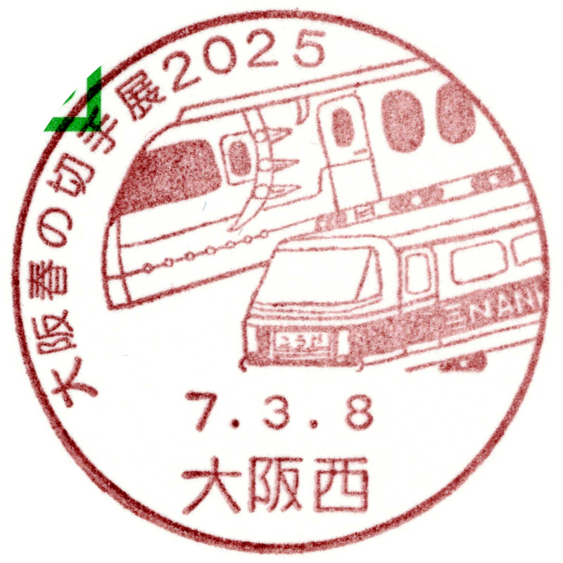 大阪春の切手展2025開催に合わせて設置された小型印です。南海の特急列車である「ラピート」と「こうや」が描かれています。 |