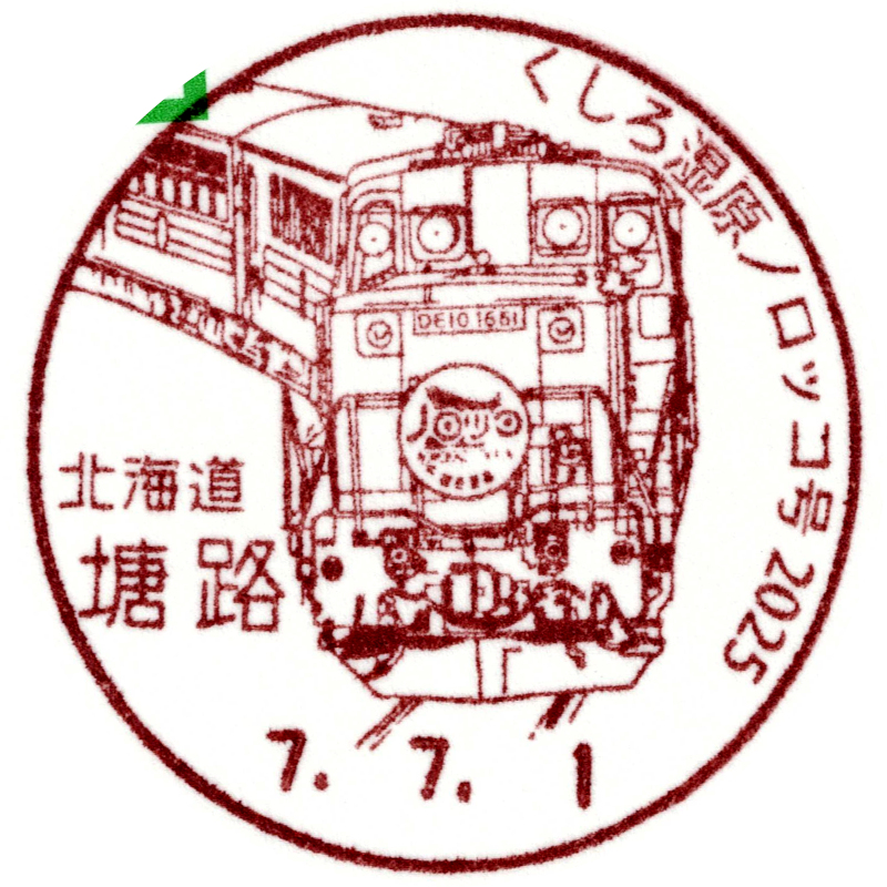 くしろ湿原ノロッコ号の運行を記念した小型印です。老朽化により新造車に置き換える計画があるらしいですが、路線の存続が危うい中で大丈夫なのか不安です。 |