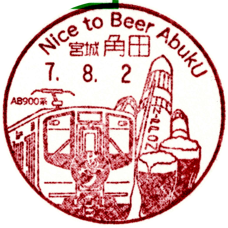 「あぶきゅうで行こう わくわくファミリーフェスタ2025in角田」という催事で使用された小型印です。阿武隈急行の新型車両であるAB900系が描かれています。 |