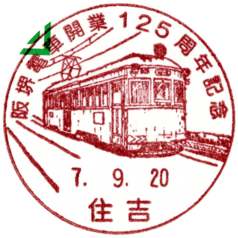 阪堺電車の開業125周年を記念した小型印です。国内現役最古の車両である「阪堺電気軌道モ161形車」が描かれています。 |