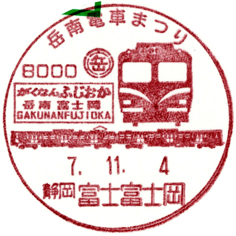 岳南電車で開催された「岳南電車まつり」を記念した風景印です。描かれている8000形は2両1本のみ在籍していて、朝夕のラッシュ時間帯のみ運用されるようです。 |