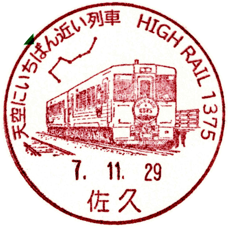 記念事項名称に「天空にいちばん近い列車 HIGH RAIL 1375」と記載されている小型印です。列車内に期間限定でポストが設置されることに伴う記念のようです。 |