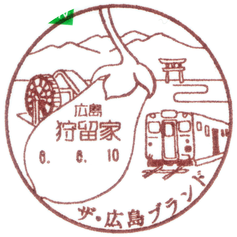 狩留家局の風景印は「狩留家町の名所・名物である、広島市「ザ・広島ブランド」の認定商品「狩留家なす」を中心に「芸備線」や「水車小屋」、「西八幡神社の鳥居」をイメージし描く」です。 |