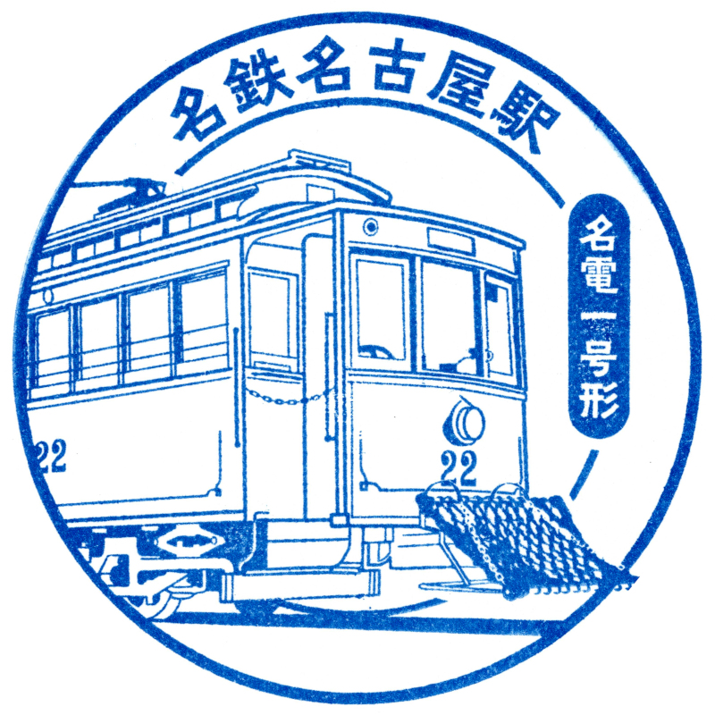 左:名鉄を代表する大ターミナル駅である名鉄名古屋駅のスタンプには名電一号形が描かれています。明治時代に造られて名鉄の前身にあたる名古屋電気鉄道が市内で運行していました。